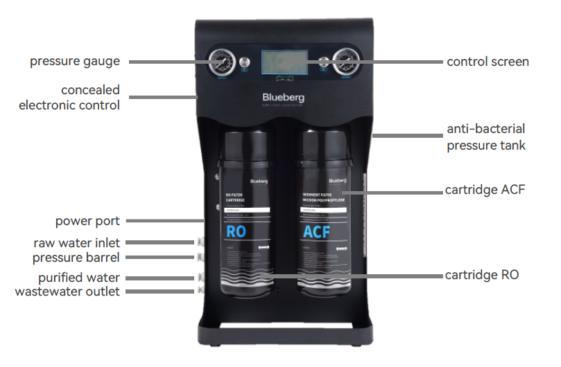 - Reverse Osmosis Membrane: A 0.0001 micron membrane that eliminates up to 99% of contaminants to ensure high-purity water.